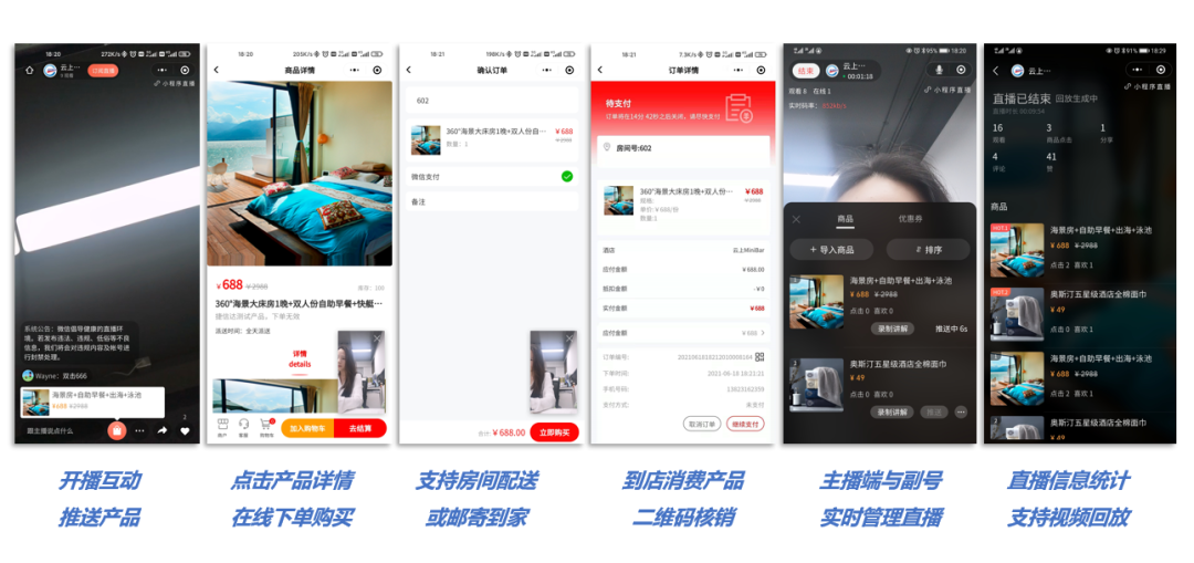 直播带货重新定义酒店营销 PMS直连助力撬动亿级流量 通过在线直播与强互动,直观地将优质、性价比高的商品展现给消费者,无论是亮点服务、环境氛围、目的地组合营销,从品牌宣传到商品销售,都将为传统酒店业带来良好转化效果。 捷信达深挖客户需求,紧跟市场趋势,全面打通小程序直播——小程序商城&小程序直播双向互通,客人一键下单直达PMS,省时省力助力酒店直播带货!
